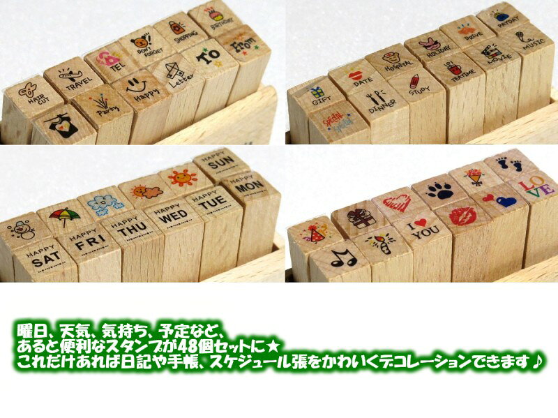 木製スタンプ 4タイプ 全48個セット 商 品 説 明 曜日、天気、気持ち、予定など、 あると便利なスタンプが48個セットに★